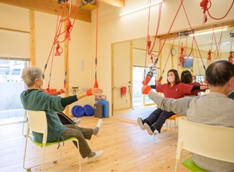 ご自宅までの送迎を行い、レッドコードを使ったストレッチ・体操、機械を使った足の運動、個別機能訓練、プリントを使っての脳トレなどのサービスを提供します。